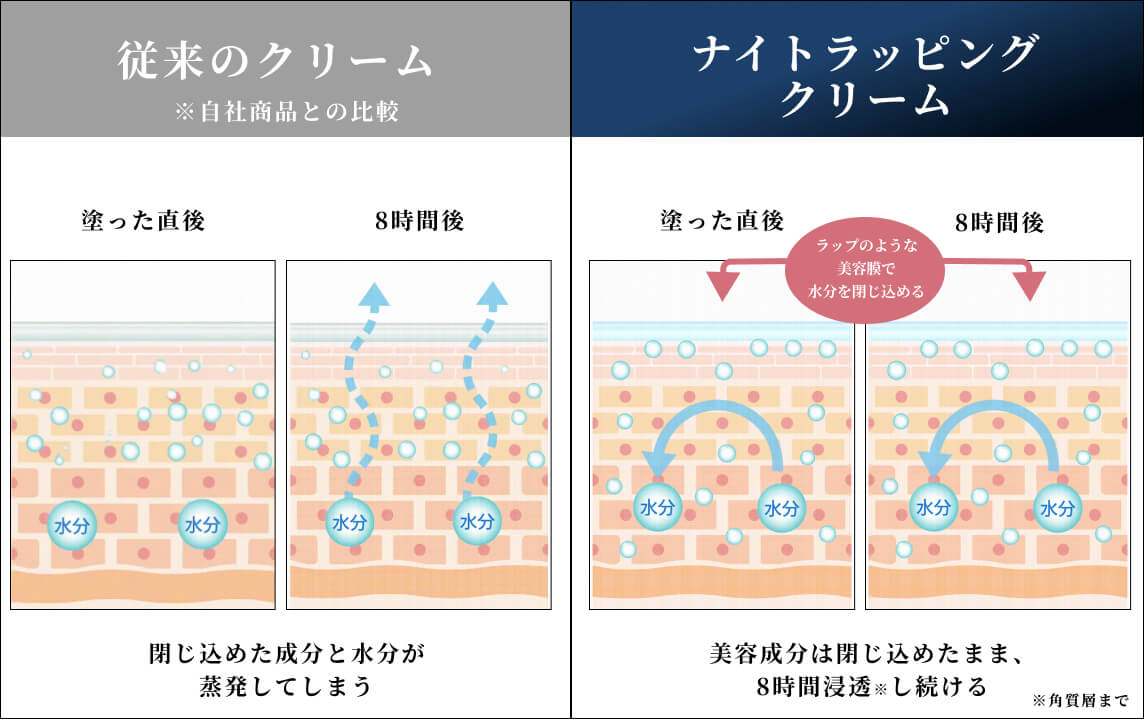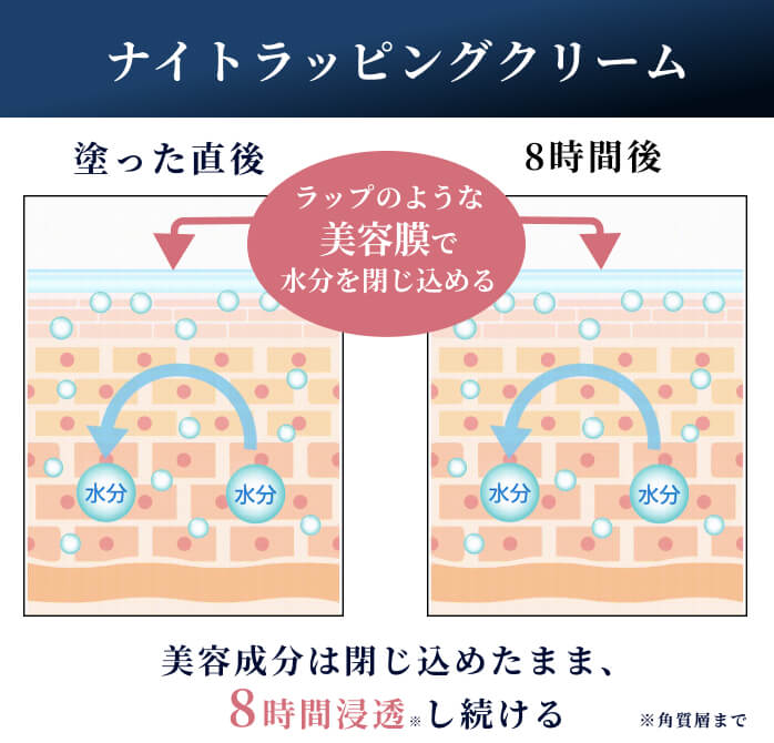 睡眠中の8時間でうるおいも美容成分も飛んでいってしまうんです。
